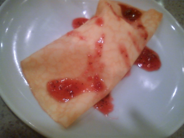 クレープ生地に包まれた、ココナツミルクプリン、イチゴソース掛け。
